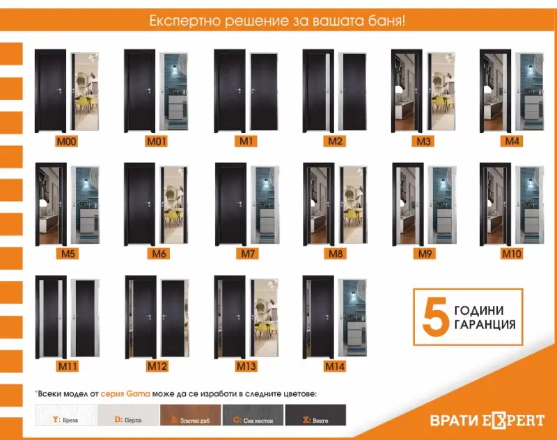 Алуминиевите врати за баня от серия Gama се предлагат в различни цветове – Златен дъб, Бреза, Венге, Сив кестен и Перла за лицева част; от страна на банята са окомплектовани с голямо огледало и MDF лайсна в цвета на крилото. MDF лайсната може да бъде заменена с алуминиева лайсна, ако вратата ще бъде подложена на обливане с вода.