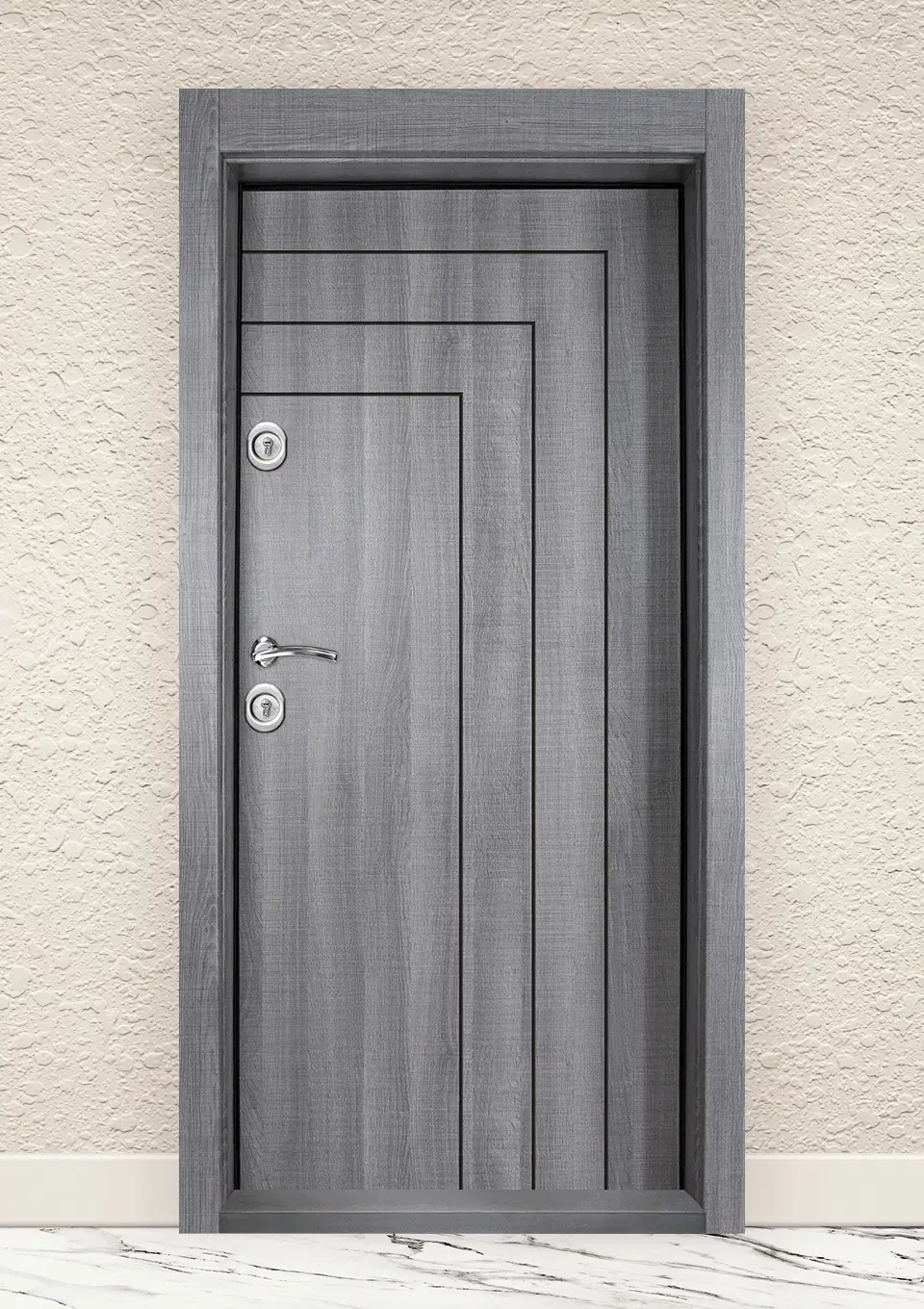 Панелът при серия Модерн е с ламиниран МДФ. Дебелината на крилото е 70 мм. Лицевият и вътрешен панел са с красива фрезована шарка. На вътрешния панел на всяко крило от серия Мoдерн е поставен допълнителен МДФ елемент, представляващ рамка на МДФ панела, придаващ завършен и стилен вид. Този модел е снабден с две независими заключващи системи, всяка с по три активни шипа. От страната на регулируемите панти крилото е подсилено с шест пасивни шипа,