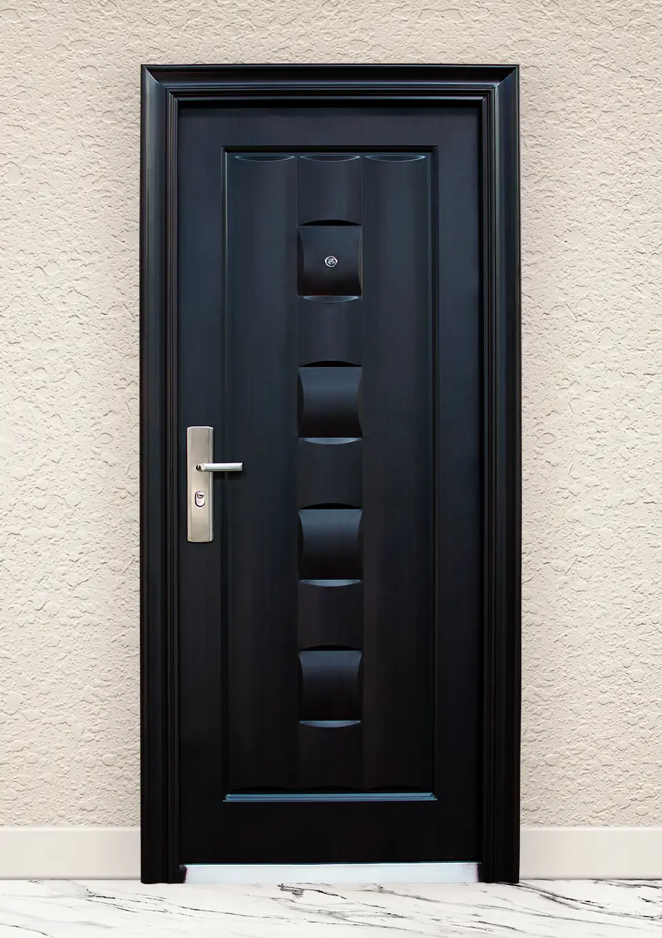Крилото на вратата е изработено от два метални листа с релефна повърхност, допълнително оребрено с метални профили и поставена между тях изолация тип „пчелна пита”. Дебелината на крилото е 50мм, покрито с машинно поставено топло пренесено PVC фолио. Касата на вратата е метална с дебелина 90мм. Покрита е с машинно поставено топлопренесено PVC фолио. Заключването е тристранно, 12-точково. Бравата заключва вратата в три посоки – нагоре, надолу и в страни с 11 шипа, като има и вътрешна ключалка с един шип.