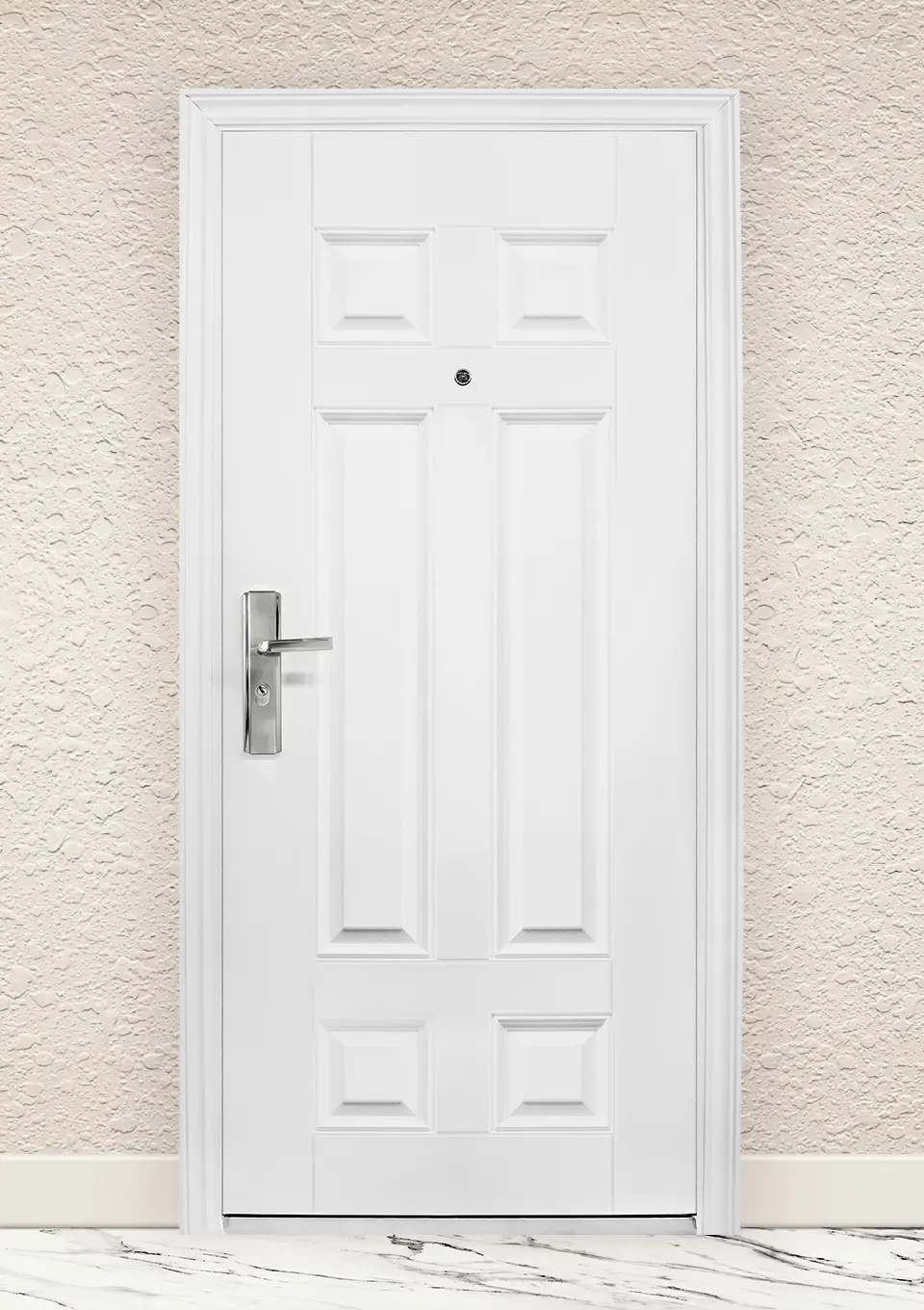 Представяме блиндирана входна врата, изработена от прахово боядисан метал и размери с касата 900/1970мм и 900/2100мм.Дебелината на крилото е 50мм, а възможните посоки на отваряне на вратата са: навътре/лява, навътре/дясна, навън/лява, навън/дясна.Ако търсите нещо по-нетрадиционно, този модел е точно за Вас. Вратата има много интересен дизайн в бял цвят и пасва идеално на жилища, които са решени в сиво-черната или бялата гама цветове. Поддръжката на повърхността й е лесна и не изисква особени усилия. Тази врата придава много интересна завършеност на цялостния облик на жилището.