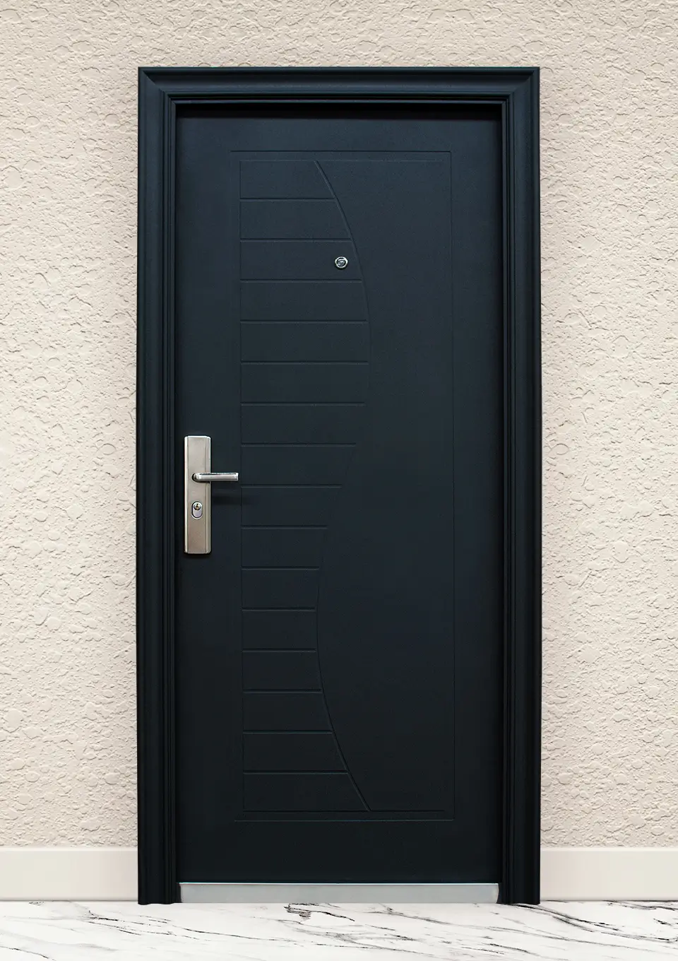 Крилото на вратата е изработено от два метални листа с релефна повърхност, допълнително оребрено с метални профили и поставена между тях изолация тип „пчелна пита”. Дебелината му е 50мм. Касата на вратата е метална с дебелина 90мм. с перваз само от едната страна. Заключването е тристранно, 12-точково. Бравата заключва вратата в три посоки – нагоре, надолу и в страни с 11 шипа, като има и вътрешна ключалка с един шип.